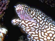 ಹಾವಿನಂತಿರುವ ಮೊರೆ ಈಲ್ ಮೀನು: ಸಮುದ್ರ ತಲದ ಕೋರಲ್ಕಾಡಿನ ಬಹು ನಿಷ್ಣಾತ ಬೇಟೆಗಾರ. ಇದರ ಮಚ್ಚೆಗಳು ಕೋರಲ್ಗಳ ಅವಿತಾಗ ತನ್ನನ್ನು ಗುರುತಿಸದಂತೆ ಮಾಡಿಕೊಂಡು ಮೀನನ್ನು ಬೇಟೆಯಾಡುತ್ತದೆ.