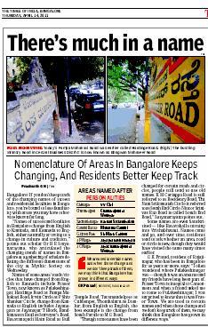 ಮೊನ್ನೆ ಅಂದರೆ ಏಪ್ರಿಲ್ 12 ಮತ್ತು 13ನೆಯ ತಾರೀಖುಗಳಂದು ಬೆಂಗಳೂರಿನ ಮಿಥಿಕ್ ಸೊಸೈಟಿಯಲ್ಲಿ ‘ಬೆಂಗಳೂರು ನಗರ ಇತಿಹಾಸ ಮತ್ತು ಪುರಾತತ್ವ’ ಕುರಿತಂತೆ ರಾಷ್ಟ್ರೀಯ ವಿಚಾರ ಸಂಕಿರಣ ನಡೆದಿತ್ತು. ನಾನು 13ರಂದು ಮಂಡಿಸಿದ ‘ಬೆಂಗಳೂರಿನ ಕೆಲವು ವಿಶೇಷ ಸ್ಥಳನಾಮಗಳು ಬದಲಾಗುವ ಪ್ರವೃತ್ತಿ’ ಎಂಬ ಲೇಖನದ ಪೂರ್ಣಪಾಠ ಇಲ್ಲಿದೆ. 14.4.11ರ ಟೈಮ್ಸ್ ಆಫ್ ಇಂಡಿಯಾ ಪತ್ರಿಕೆ ಈ ಪ್ರಬಂಧದ ಬಗ್ಗೆ ವಿಶೇಷ ವರದಿಯನ್ನು ಪ್ರಕಟಿಸಿತ್ತು. ಅದರ ಚಿತ್ರವನ್ನು ಇಲ್ಲಿ ಕಾಣಿಸಿರುತ್ತೇನೆ.