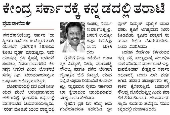 ನೆನ್ನೆ ನಡೆದ ಸಂಸತ್ ಕಲಾಪದಲ್ಲಿ ನಮ್ಮ ರಾಜ್ಯದಿಂದ ಆಯ್ಕೆಯಾದ ಲೋಕಸಬಾ ಸದಸ್ಯರಾದ ಚಲುವರಾಯಸ್ವಾಮಿಯವರು ಕನ್ನಡದಲ್ಲಿ ಬಾಶಣ ಮಾಡಿ ಗಮನ ಸೆಳೆದಿದ್ದಾರೆ. ಬಹಳ ದಿನಗಳ ಮೇಲೆ ಸಂಸತ್ತಿನಲ್ಲಿ ಕನ್ನಡದ ಕಂಪು ಮೊಳಗಿದೆ.