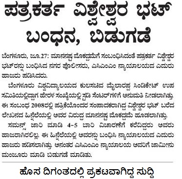 ಇವೆಲ್ಲವನ್ನೂ ಹೇಳಲು ಕಾರಣ ಹಾಲಿ ಕನ್ನಡ ಪ್ರಭ ಪತ್ರಿಕೆಯ ಸಂಪಾದಕರೂ, ಸುವರ್ಣ ಸುದ್ದಿ ವಾಹಿನಿಯ ಮುಖ್ಯಸ್ಥರೂ ಆದ ವಿಶ್ವೇಶ್ವರ ಭಟ್ಟರು ಜೂನ್ 27ರಂದು ಬಂಧಿತರಾಗಿ ಮಧ್ಯಾಹ್ನದ ನಂತರ ಜಾಮೀನಿನ ಮೇಲೆ ಬಿಡುಗಡೆಗೊಂಡಿದ್ದಾರೆ. 2008ರಲ್ಲಿ ವಿಜಯ ಕರ್ನಾಟಕದ ಸಂಪಾದಕರಾಗಿದ್ದ ಸಮಯದಲ್ಲಿನ ಒಂದು ವರದಿಯ ಕುರಿತಂತೆ ಮಾನನಷ್ಟ ಮೊಕದ್ದಮೆ ಎದುರಿಸುತ್ತಿದ್ದರು. ನ್ಯಾಯಾಲಯದಿಂದ ಪದೇ ಪದೇ ಸಮನ್ಸ್ ಜಾರಿಯಾದಾಗ್ಯೂ ಕೂಡ ಹಾಜರಾಗಲಿಲ್ಲ. ಕೊನೆಗೆ ಬೇಸತ್ತ ನ್ಯಾಯಾಲಯ ಅರೆಸ್ಟ್ ವಾರೆಂಟ್ ಜಾರಿ ಮಾಡಿತು. ಭಟ್ಟರ ಬಂಧನವಾಯಿತು.